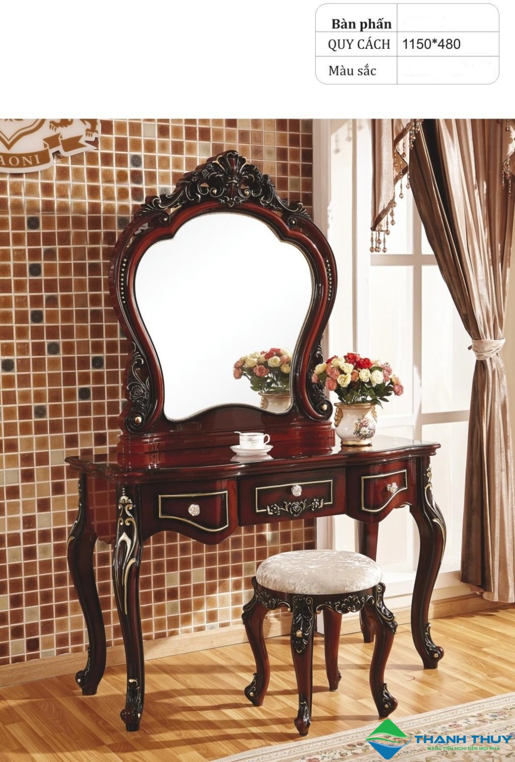 - Phong cách thiết kế: Tân cổ điển sang trọng với những đường nét được điêu khắc tỉ mỉ, tinh xảo và tinh tế. Chắc chắn đặt bộ bàn phấn này trong không gian phòng ngủ sẽ tôn thêm nét quý phái và tính thẩm mỹ của căn phòng.