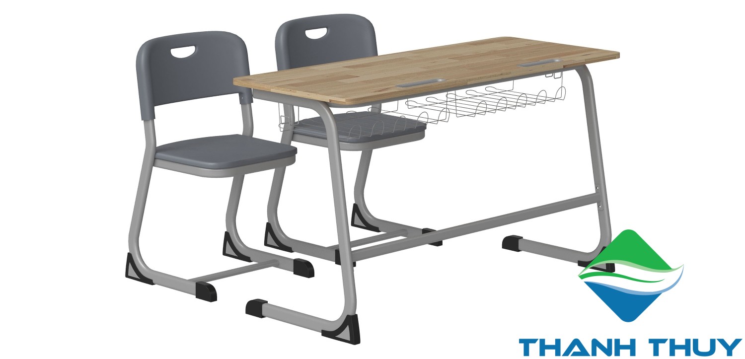BHS44G: khung thép sơn tĩnh điện màu ghi, mặt gỗ cao su phủ Poly. Bàn có ngăn để đồ và móc cặp tiện dụng