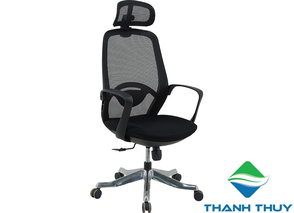 Ghế lưới lưng cao, khung tựa nhựa bọc vải lưới, đệm mút đúc bọc vải êm ái, dưới đệm có ốp nhựa cao cấp. Tay ghế bằng nhựa cố định. Chân hợp kim nhôm
